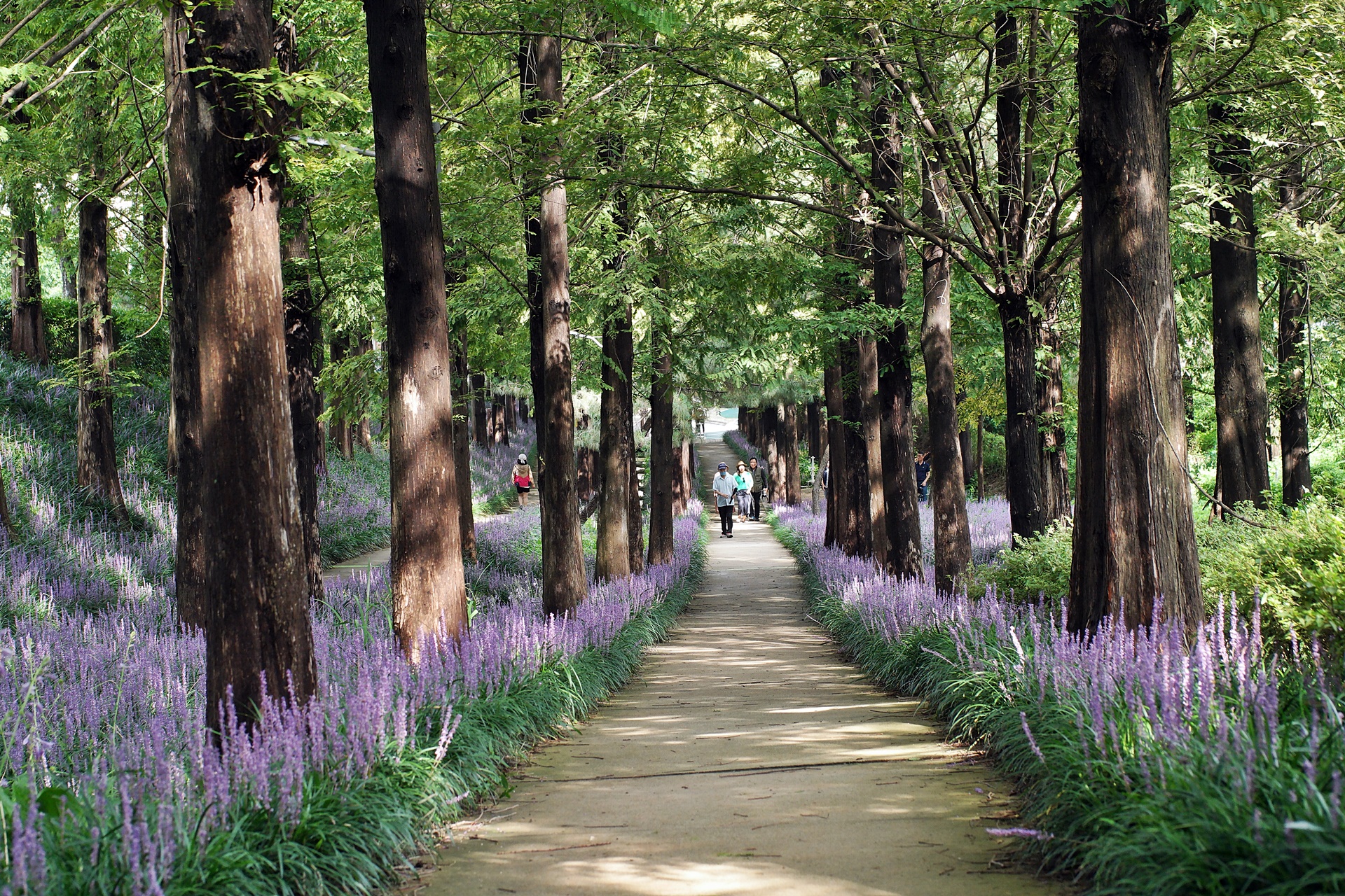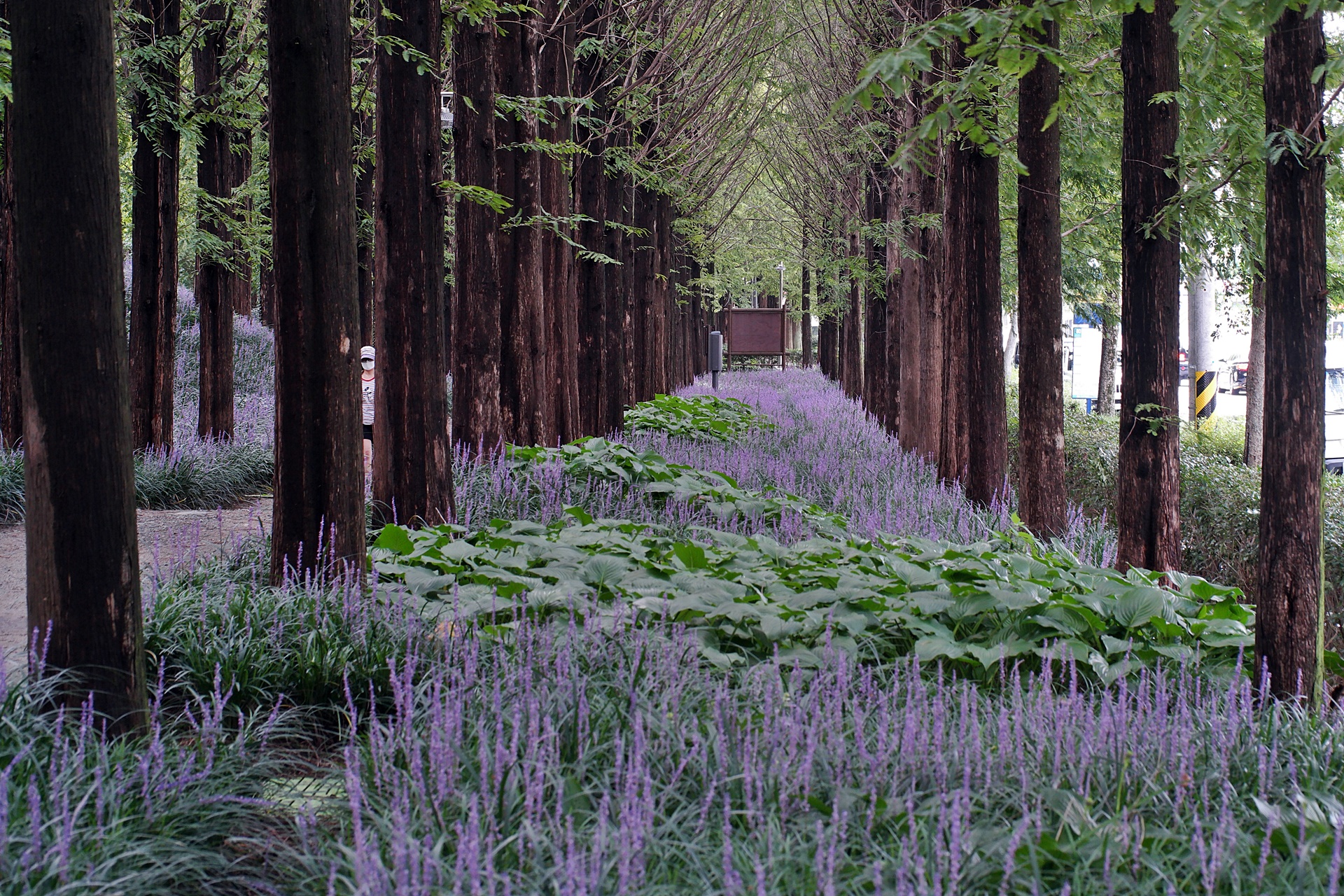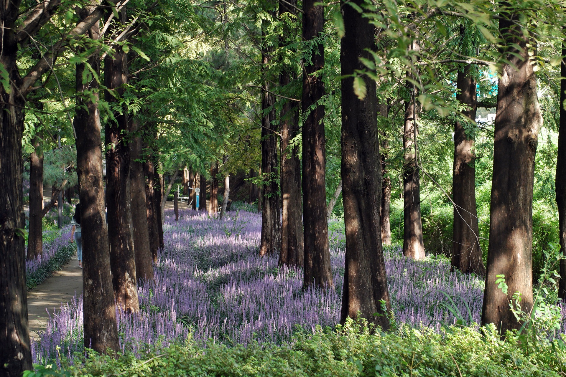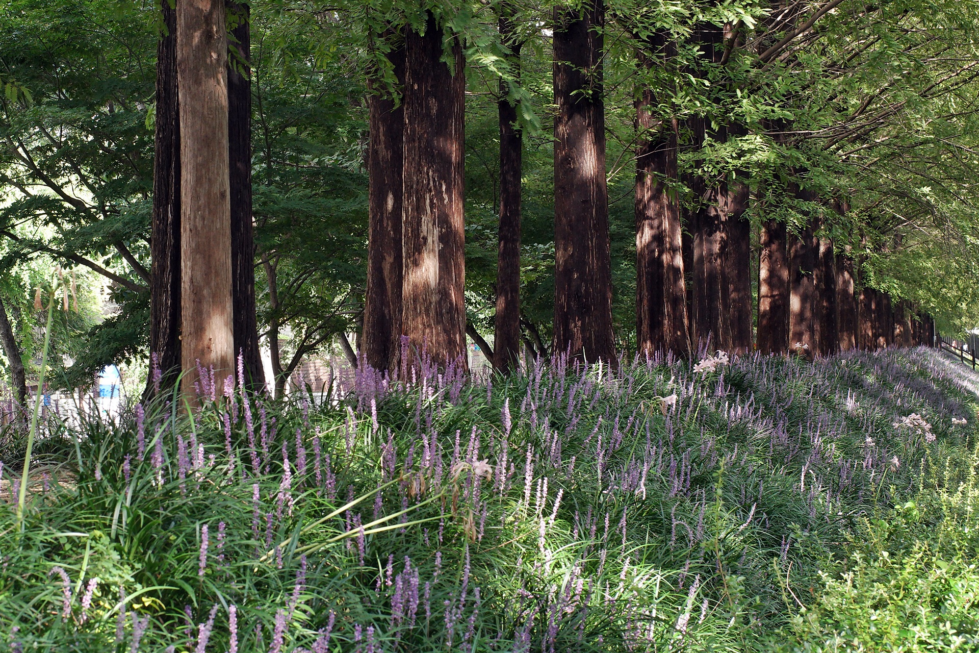 푸른 메타세콰이어가 보라색 융단을 깔고 앉은 듯
