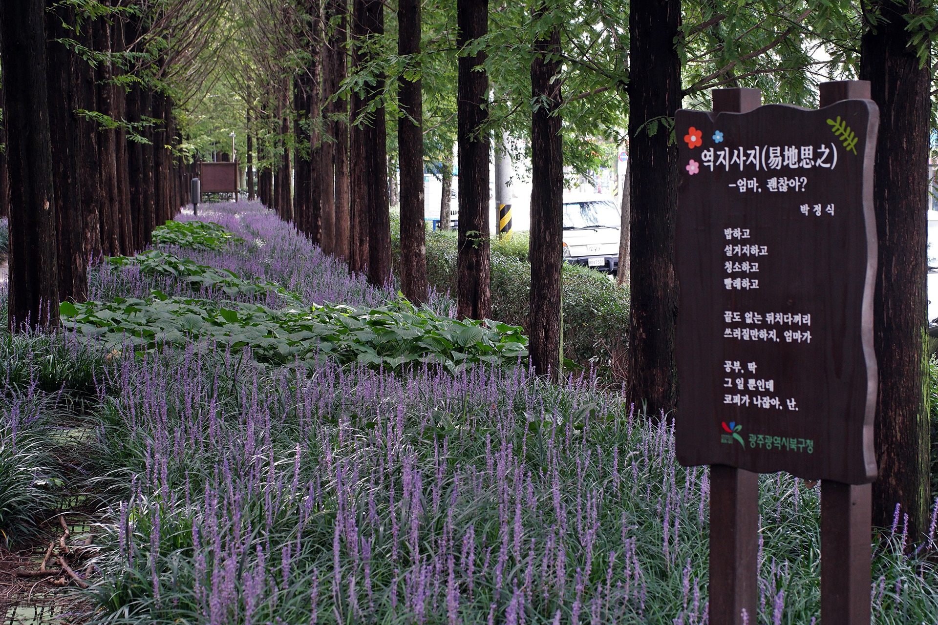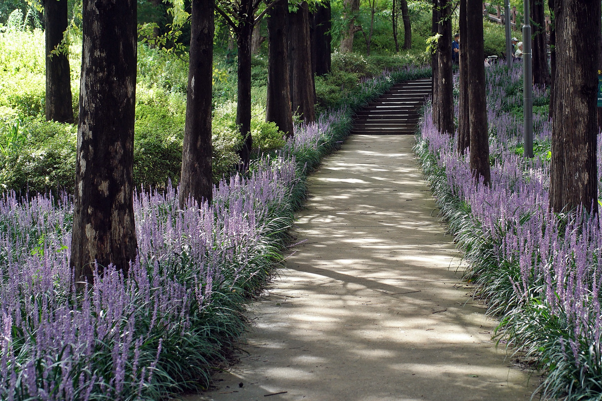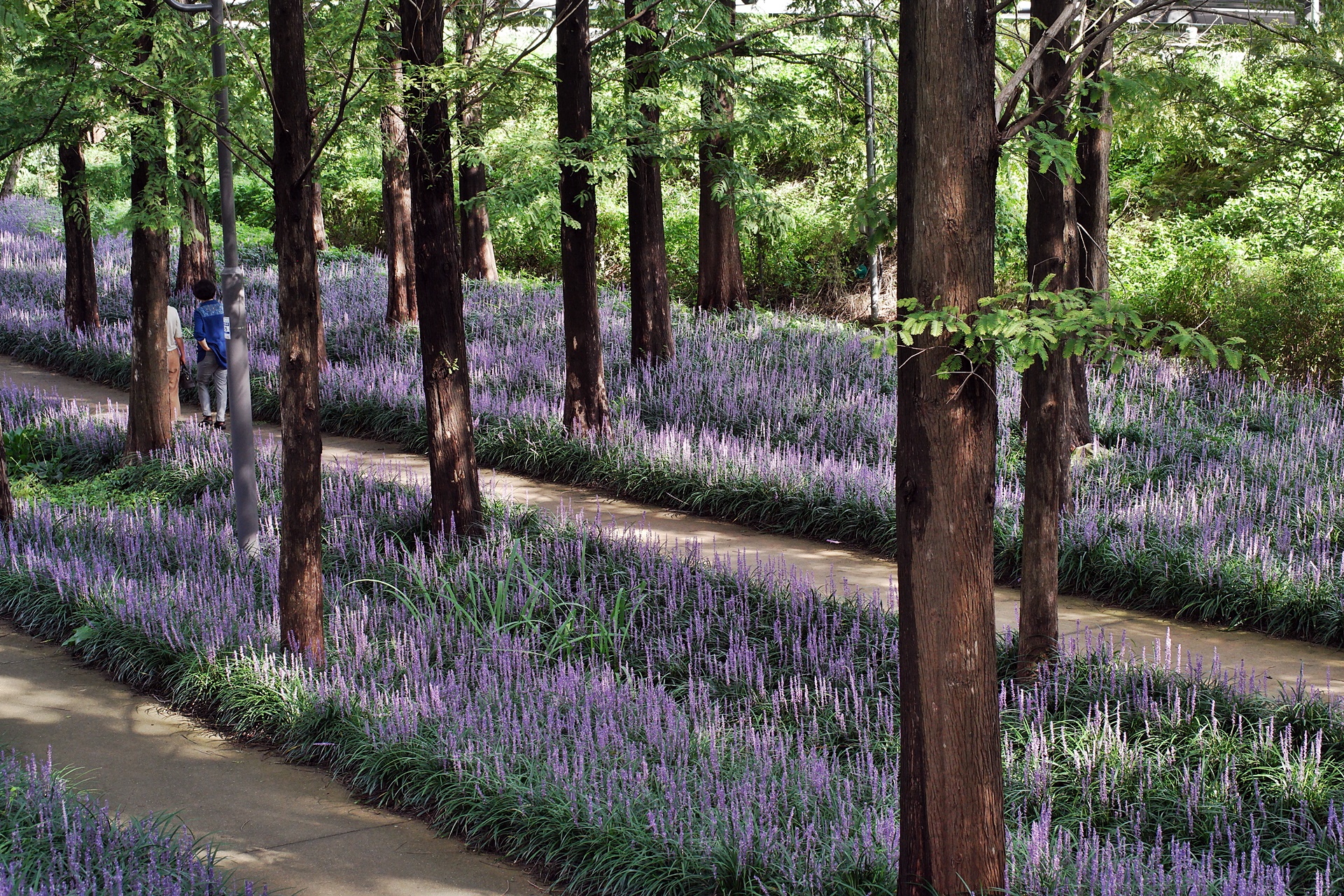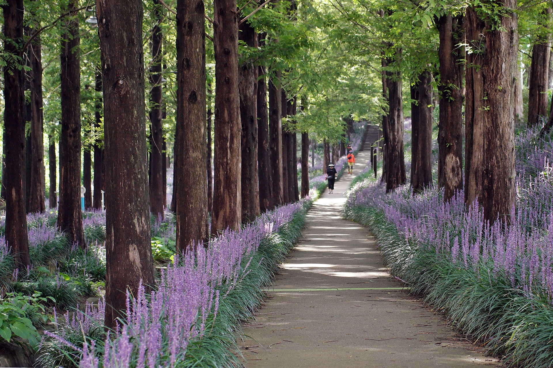 푸른 메타세콰이어가 보라색 융단을 깔고 앉은 듯