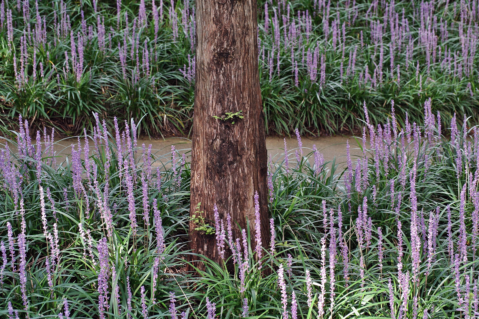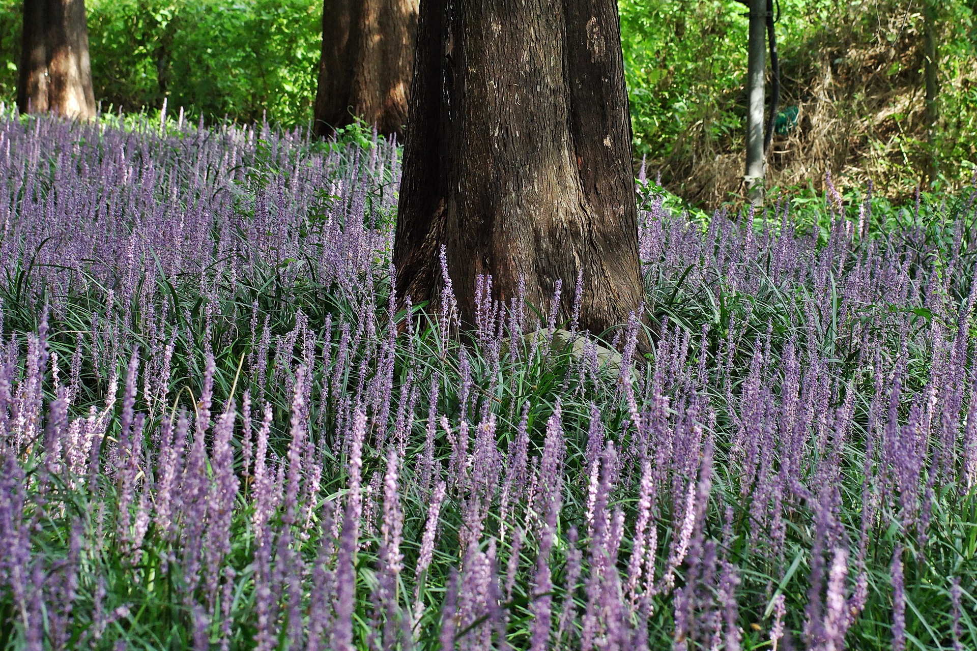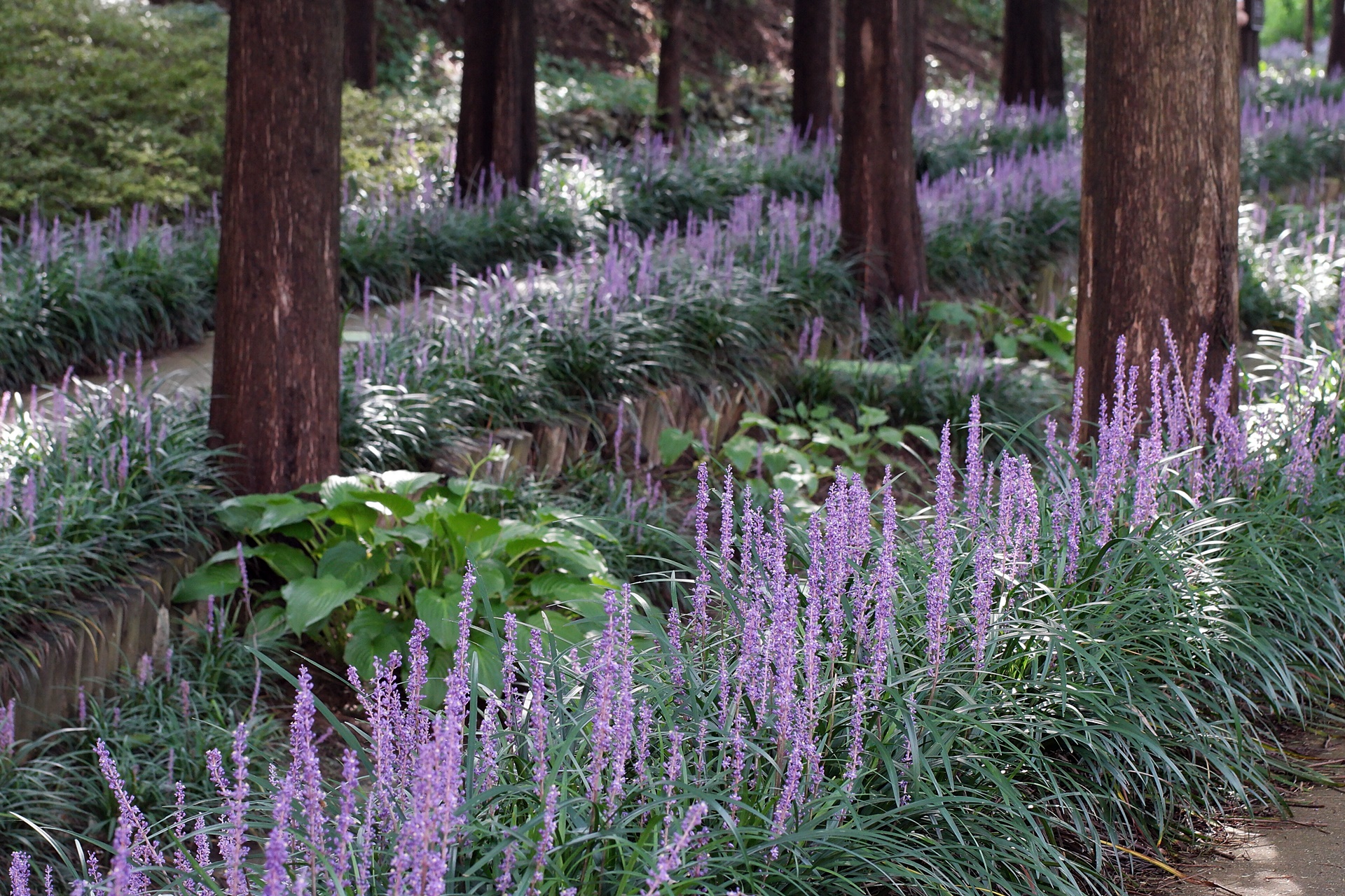나무 그루터기마다 맥문동이 고운 빛깔을 뽐내고 있습니다