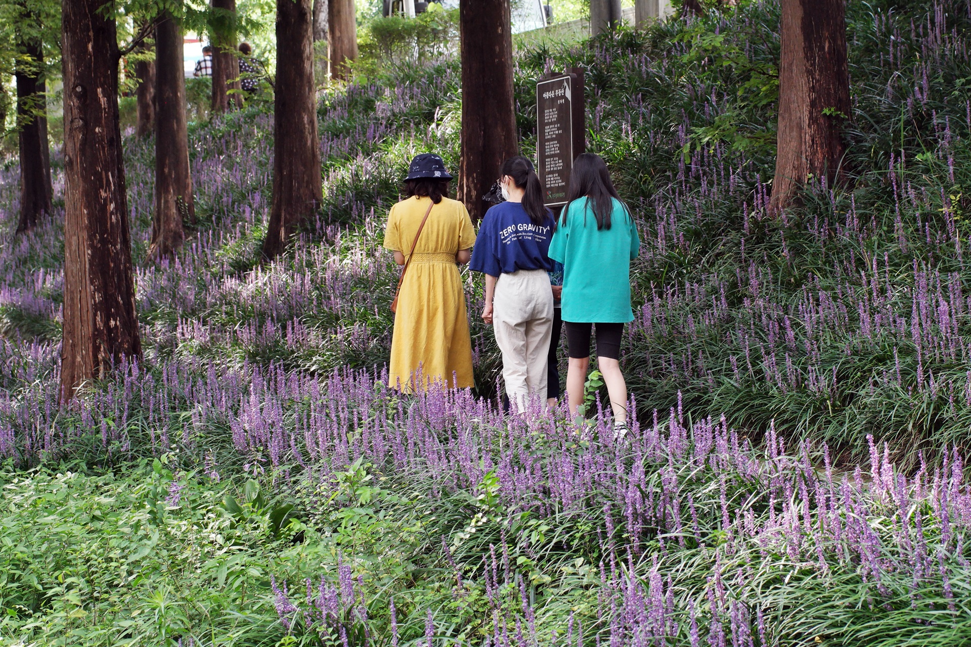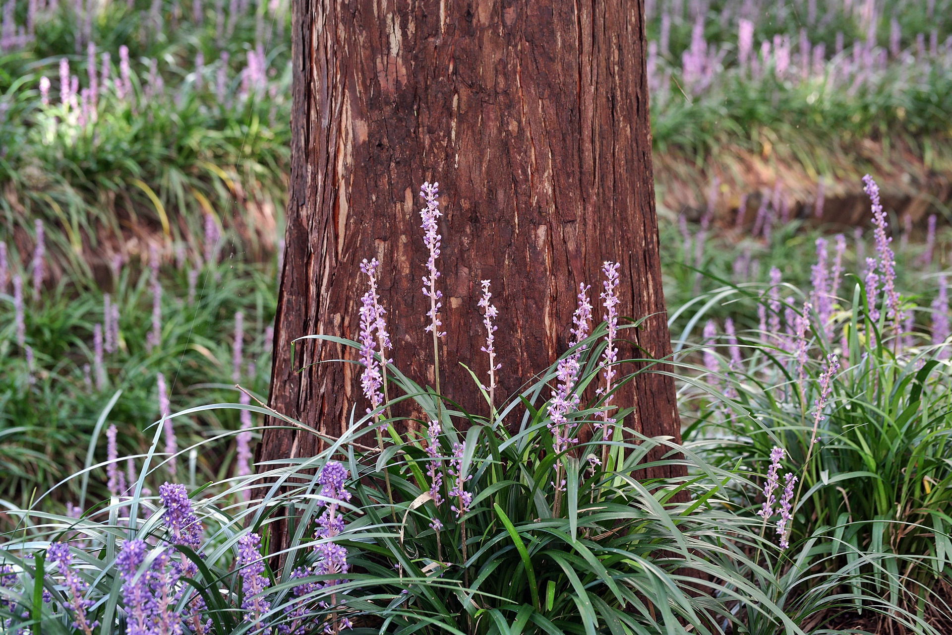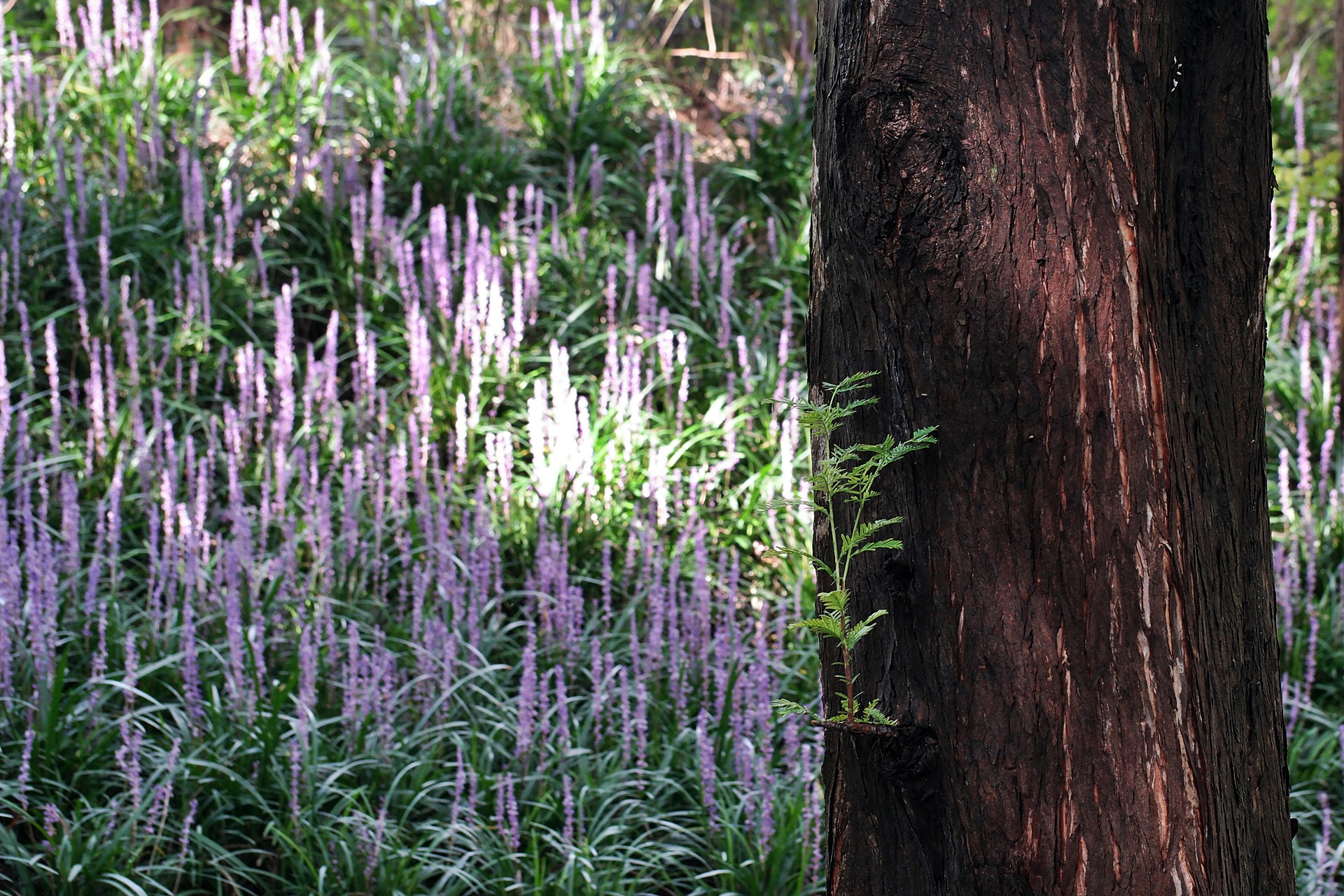 나무 그루터기마다 맥문동이 고운 빛깔을 뽐내고 있습니다
