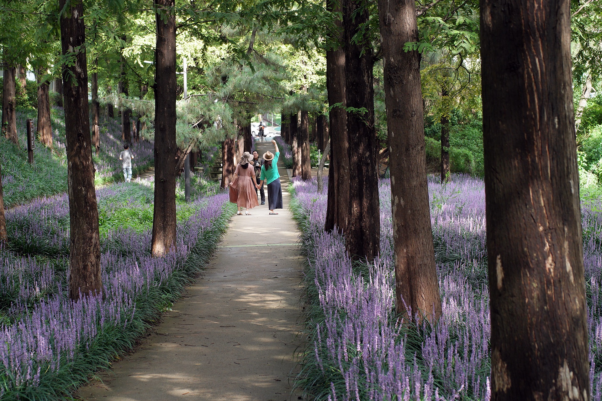 푸른 메타세콰이어가 보라색 융단을 깔고 앉은 듯