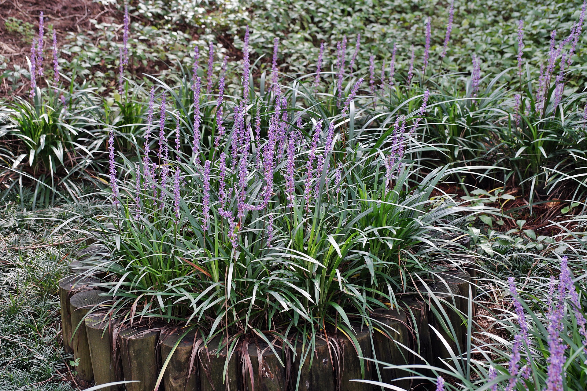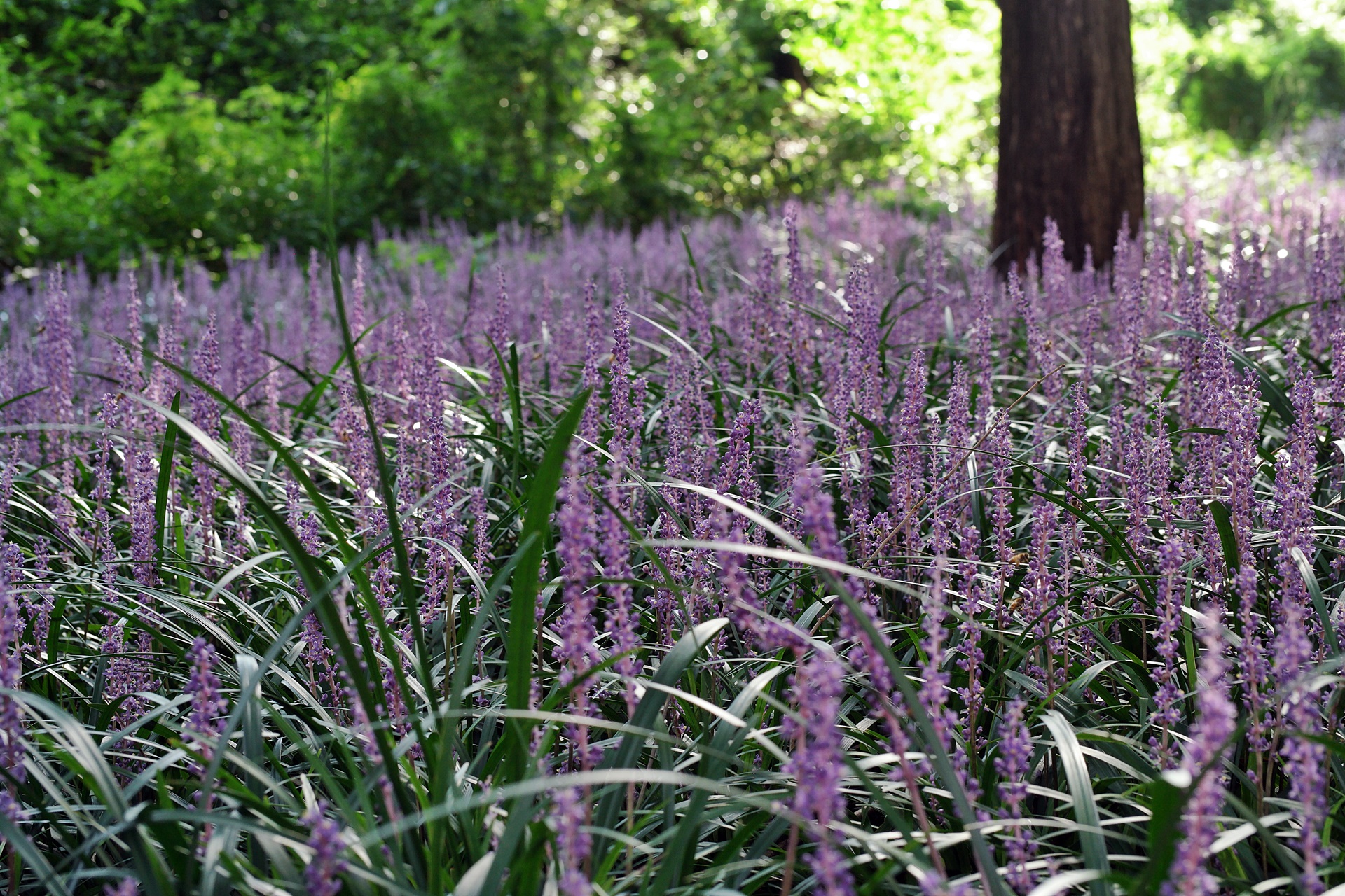 나무 그루터기마다 맥문동이 고운 빛깔을 뽐내고 있습니다