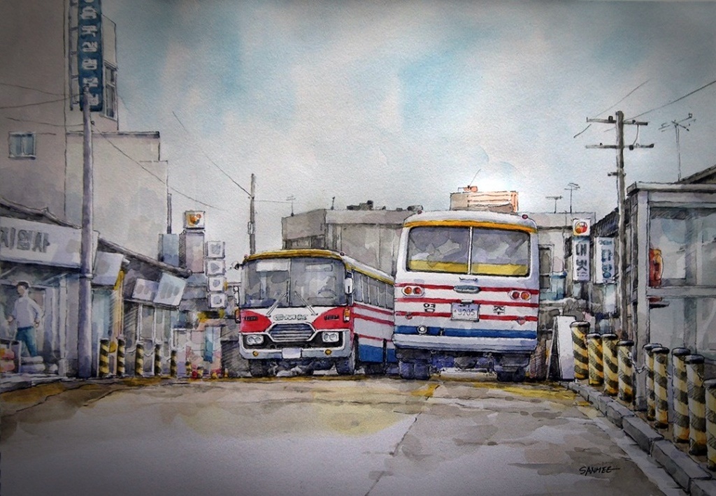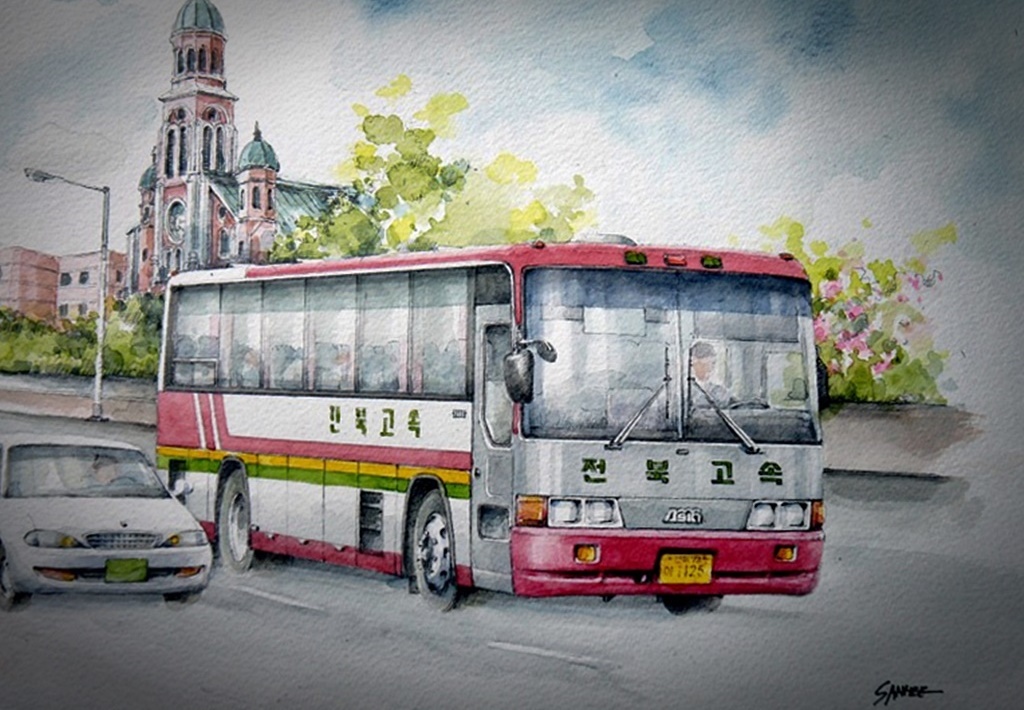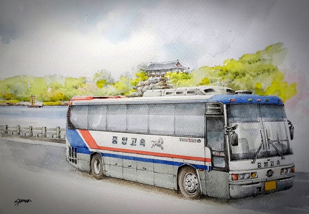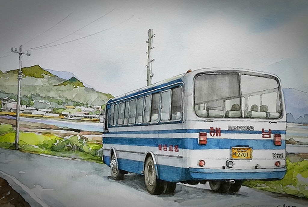 광주와 완도를 오가던 광주고속 직행버스를 햇살 밝은 완도항을 배경으로 그려보얐습니다.