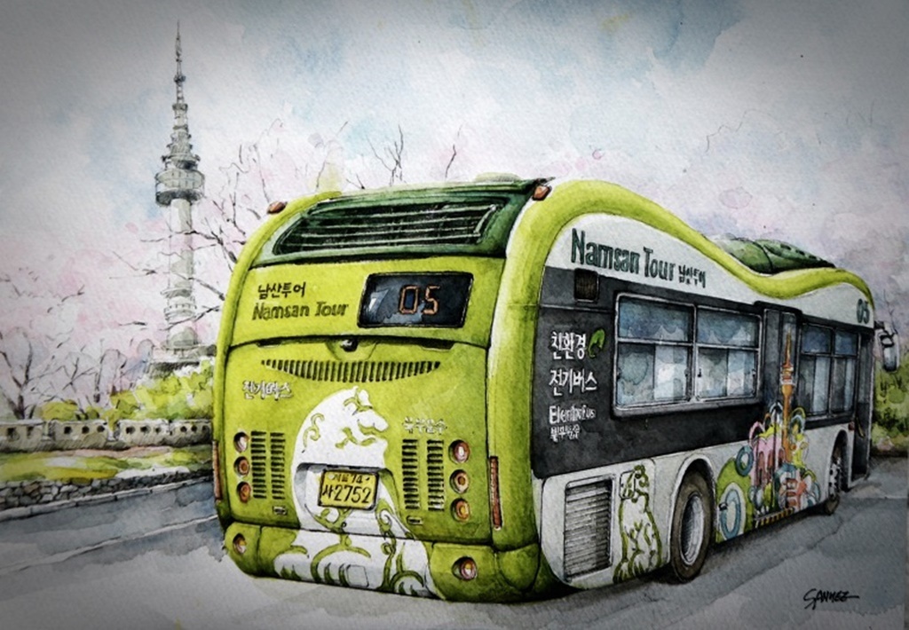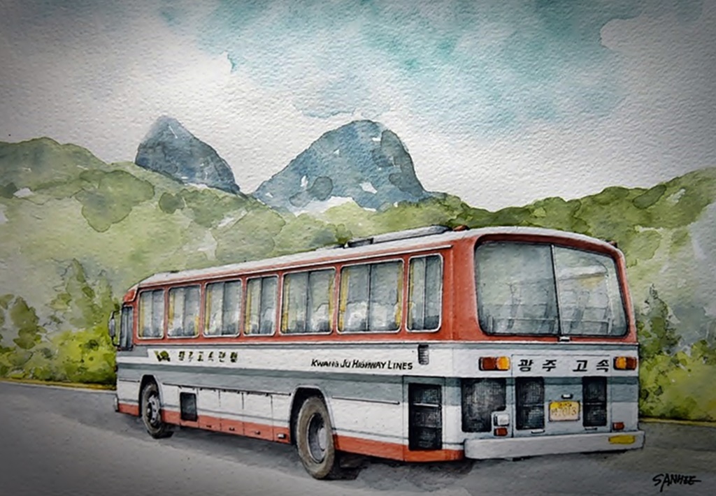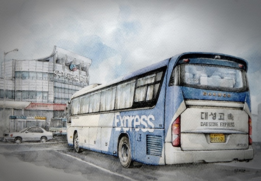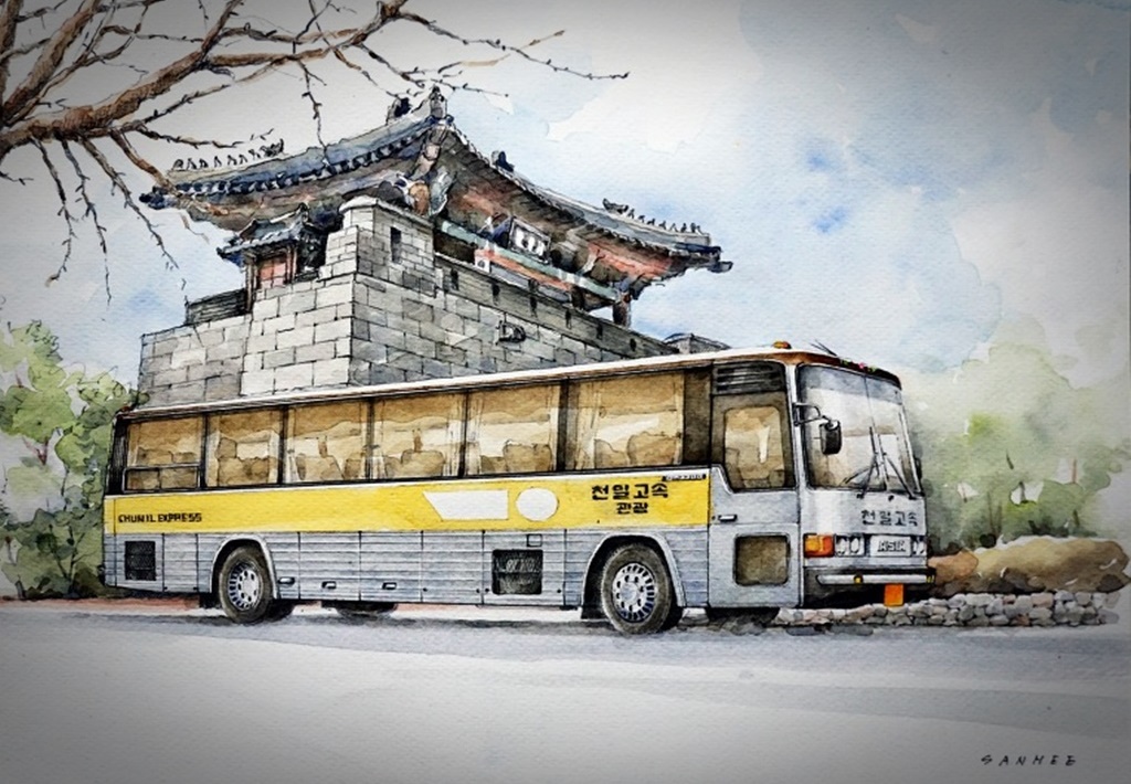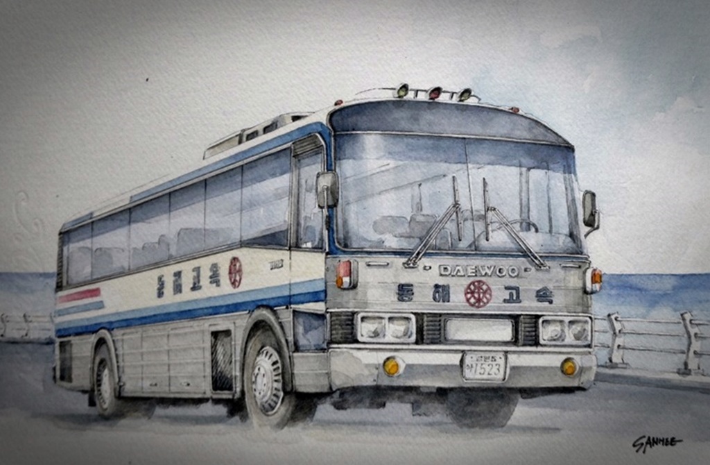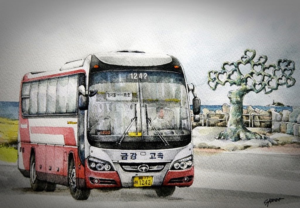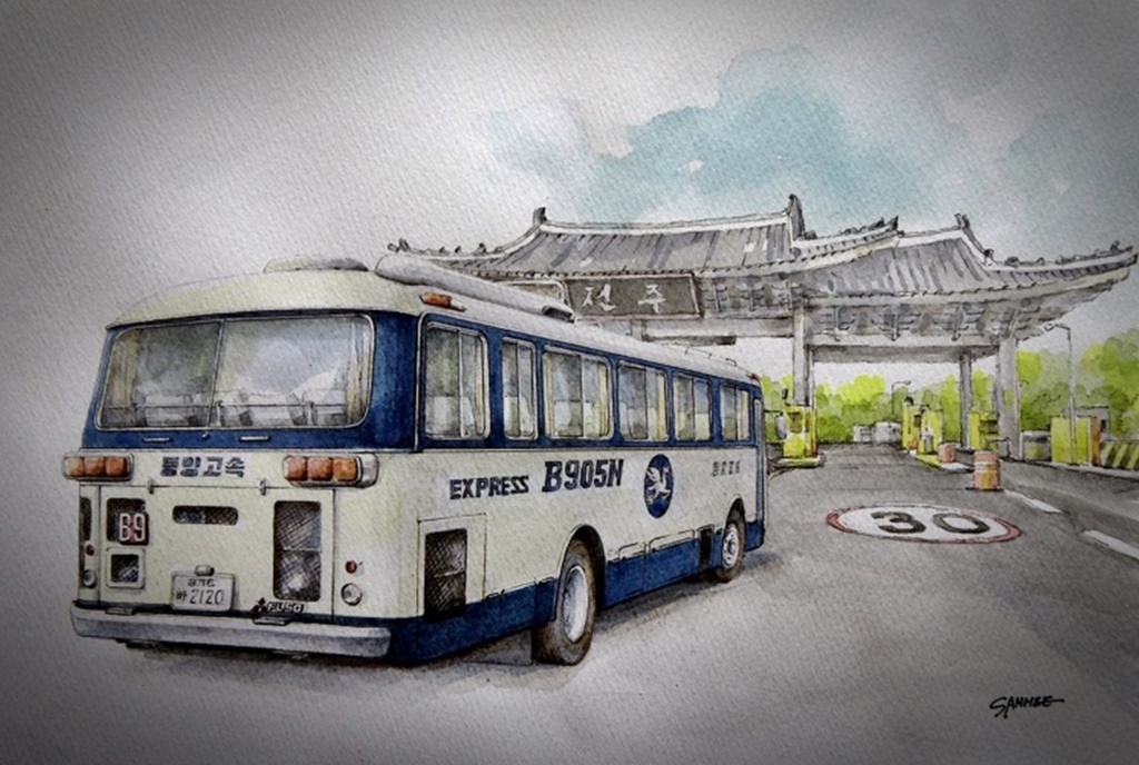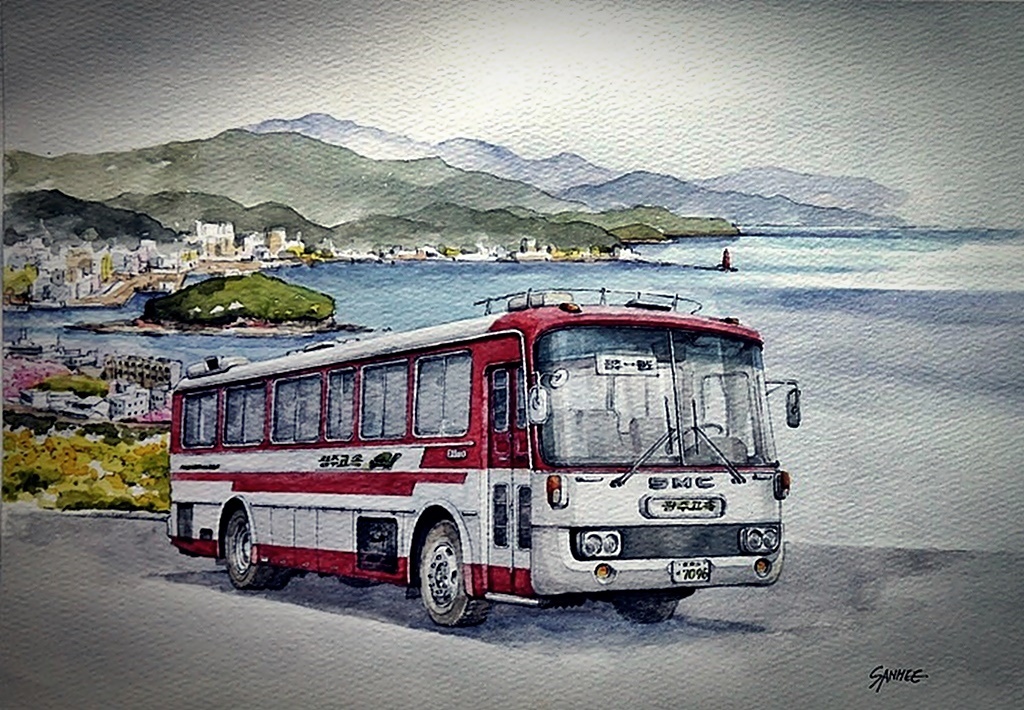 광주와 완도를 오가던 광주고속 직행버스를 햇살 밝은 완도항을 배경으로 그려보얐습니다.