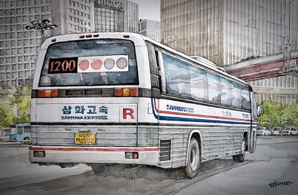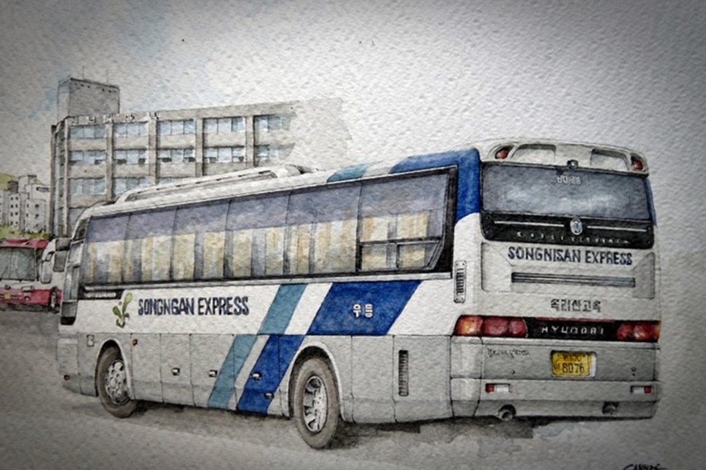 옛 기억으로만 남은 속리산고속의 도색및 하이클래스. 청주 고속버스터미널을 배경으로 화지에 옮겼습니다.