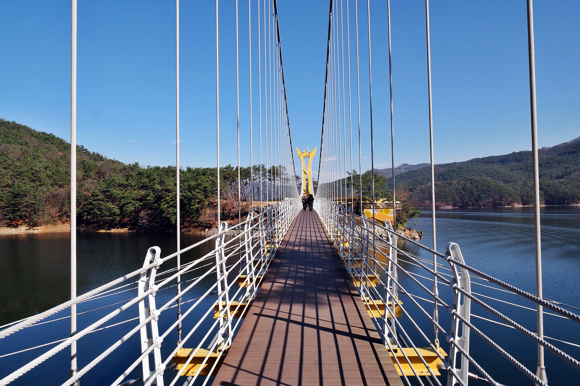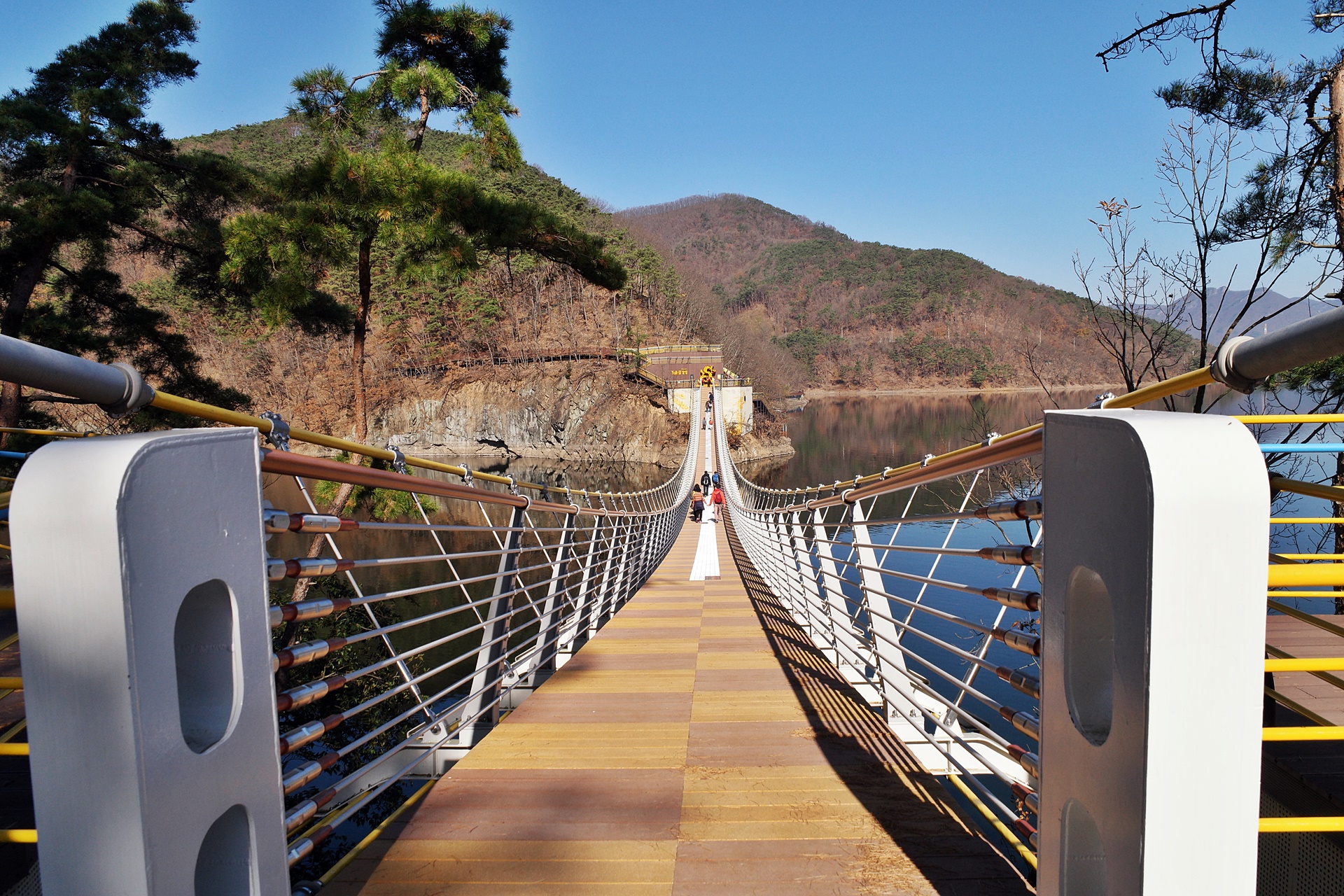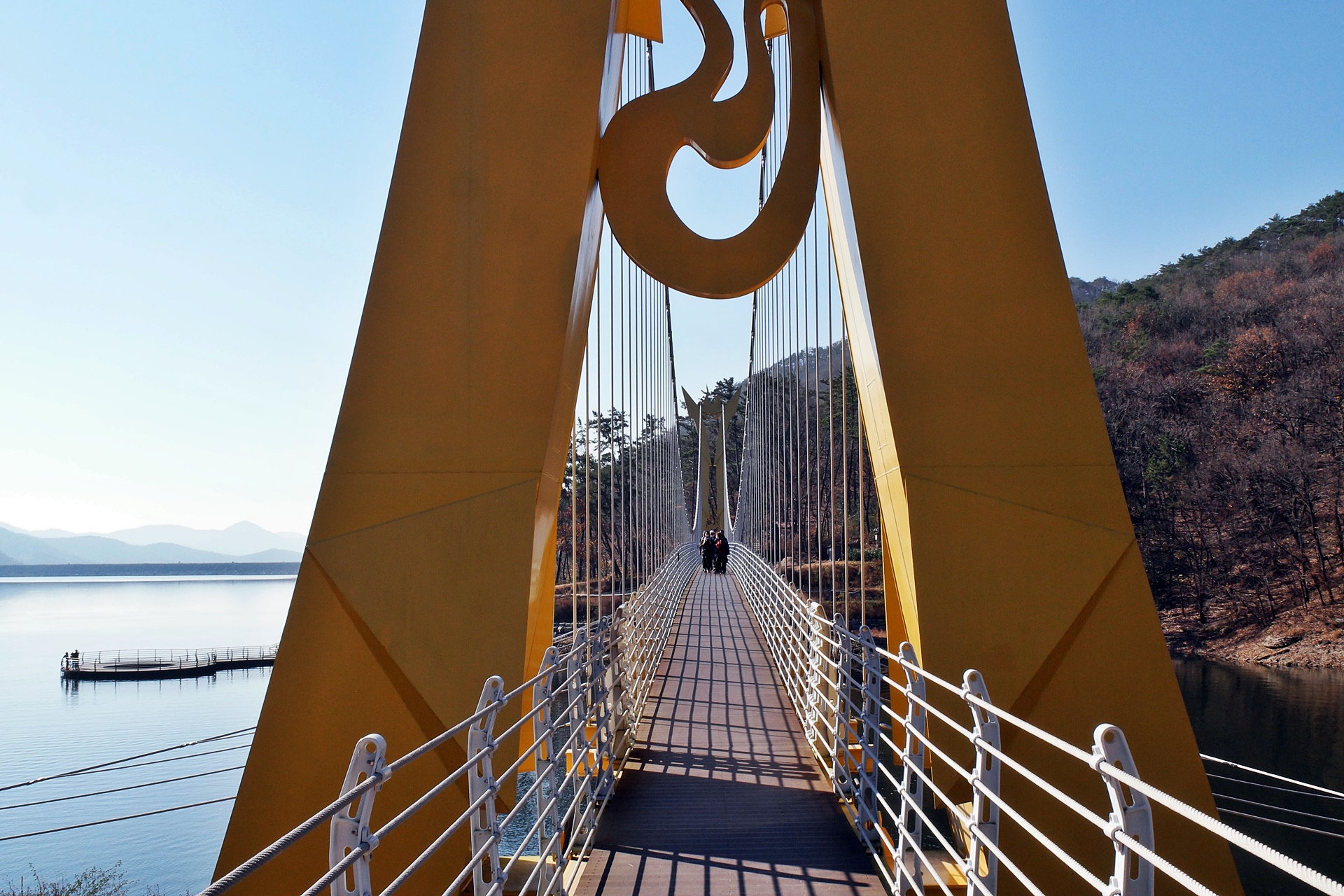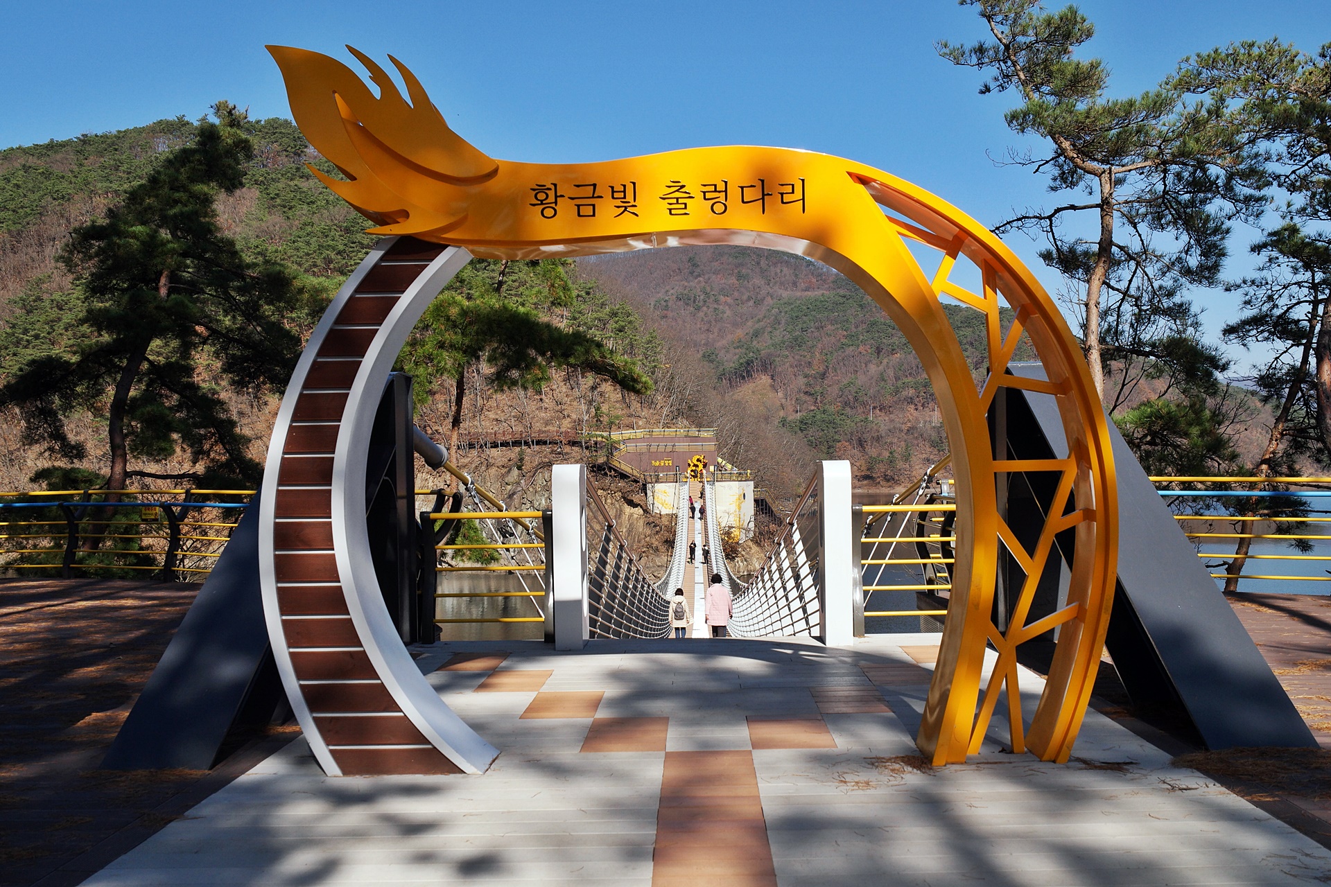 옐로우출렁다리를 지나 다시 1킬로를 더 가면 황금빛출렁다리에 도착하는데 길이는 154미터로 2020년 6월에 개통