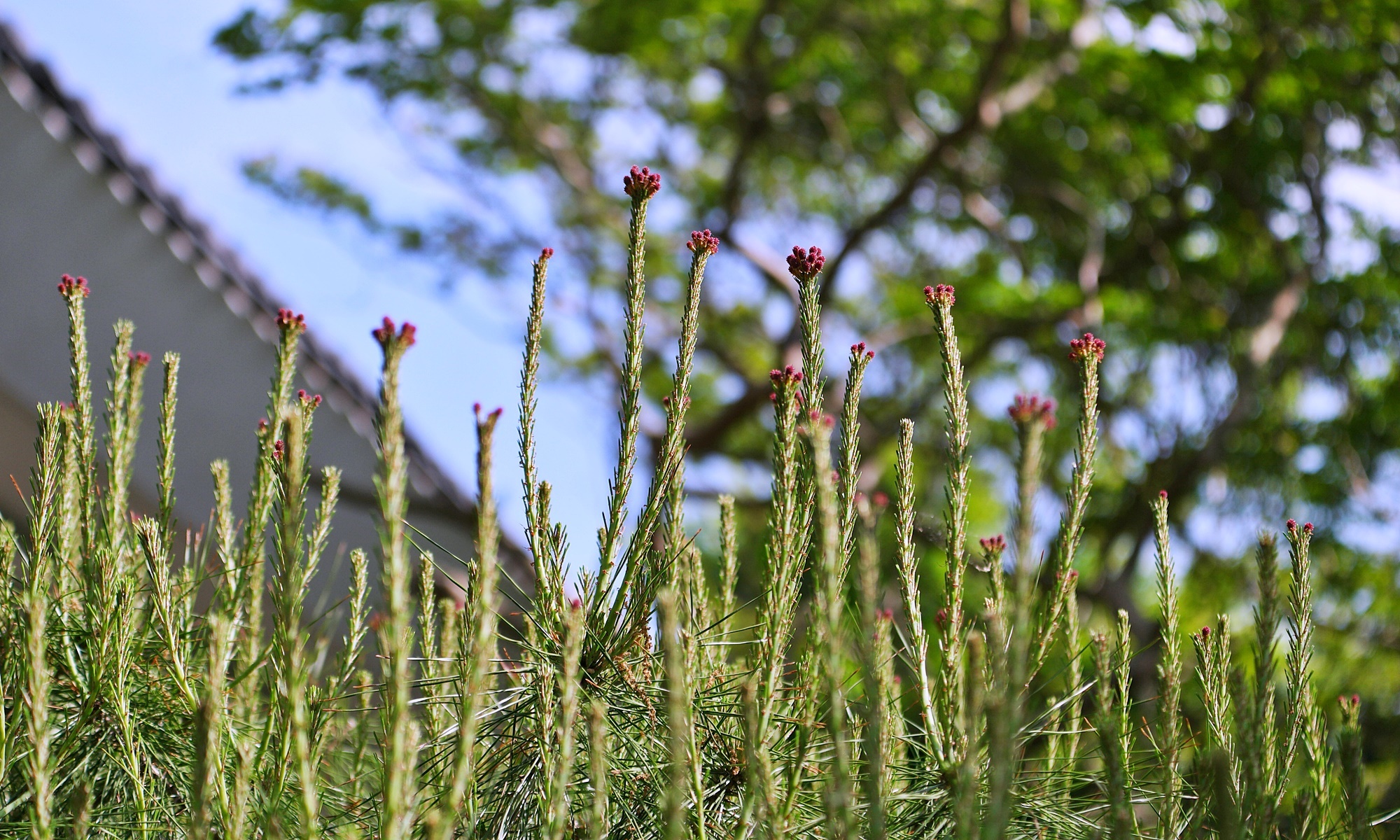 노란 꽃가루가 옥수수처럼 달려 있는 꽃이 숫꽃이고 소나무 위에서 서로 키 재기라도 하는듯 하늘을 향하여 피어